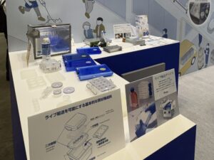 展示内容については、前回の記事(参考URL:こちら)でもご紹介しました通り、製品開発と閉鎖型培養・灌流培養、ライブ輸送の3つのテーマで構成しました。